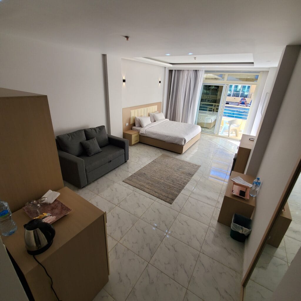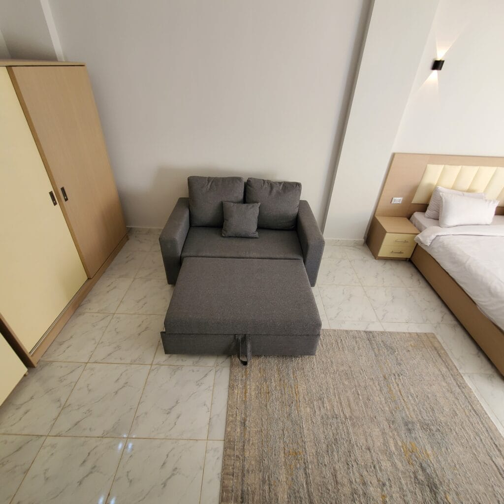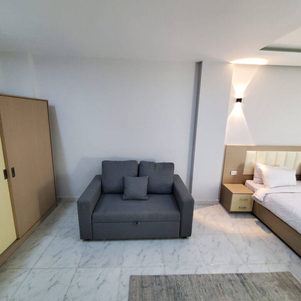 - Spacious Studio Layout – Thoughtfully designed to maximize space, featuring a plush bed, a compact yet fully equipped kitchenette, and a stylish seating area.